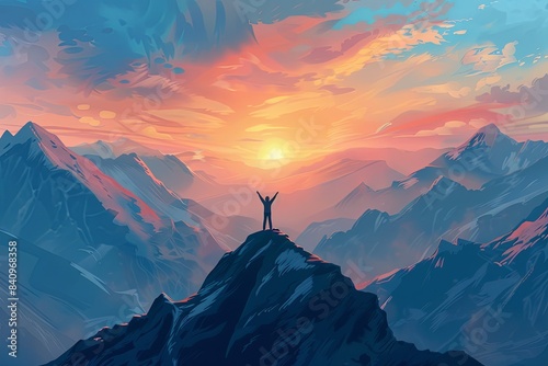 A lone figure stands triumphantly on a mountain peak, arms raised in victory, with a stunning sunrise illuminating the vast, breathtaking landscape. Generative AI