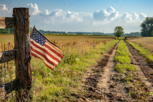 Close-up of an American flag hanging on a rustic wooden fence in a rural area. A backdrop of sunny blue skies and green fields symbolizing the heartland of America.