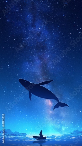 Lone fisherman watching a giant whale swimming across the milky way galaxy