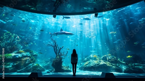 水族館のサメが泳ぐ水槽の前に立つ女性のシルエット
