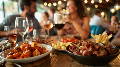 A tapas bar in Spain, with patrons enjoying small plates like chorizo, patatas bravas, and gambas al ajillo, surrounded by lively conversation.