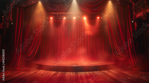 A burlesque cabaret Stage with Red Velvet Curtains, soft lighting evoking a sense of timeless, awe inspiring wonder. Generative AI.