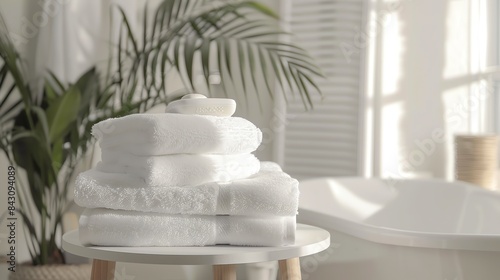 White towels and soap on a table in a bathroom. The towels are folded and stacked, and the soap is placed on top.