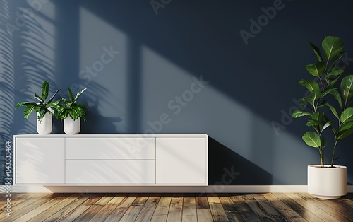 3D rendering of a white cabinet with plants on a wooden floor and navy blue wall background in a modern living room interior mock up in a minimal style, empty space for text or product display