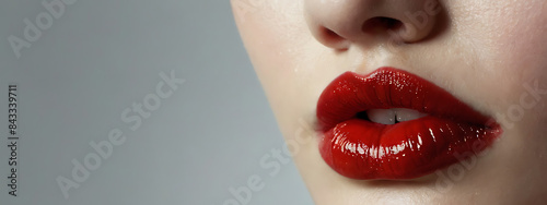 Closeup of a Blood drop trickled down on the red lips and delicate chin of a lady, murder concept