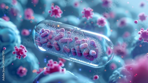 3D illustration of antibiotic capsule with pink and blue bacteria, highlighting antimicrobial resistance and medical research in microbiology.