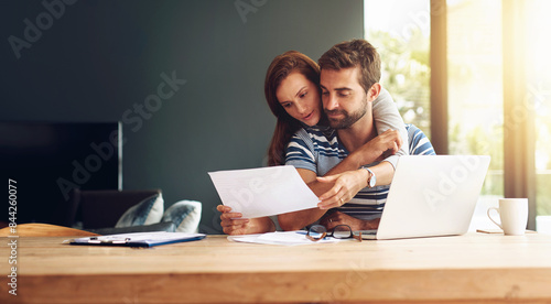 Documents, finance and laptop with couple in home together for bank investment or savings. Accounting, budget or computer for wealth management with man and woman in apartment for tax planning