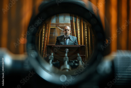 View of a politician through the optical sight of a sniper rifle, assassination
