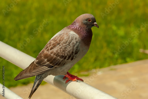 Gołąb siedzący na poręczy pomostu nad stawem w miejskim parku. Ptak z czerwonymi nogami i oczami siedzący na metalowej poręczy rozgląda się ciekawie.