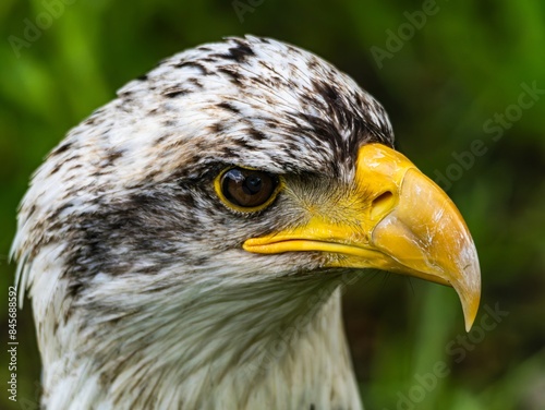 American bald eagle portrait. close-up view, its intricate feathers and distinctive yellow beak showcased against a softly blurred natural backdrop, evoking a sense of wild beauty.