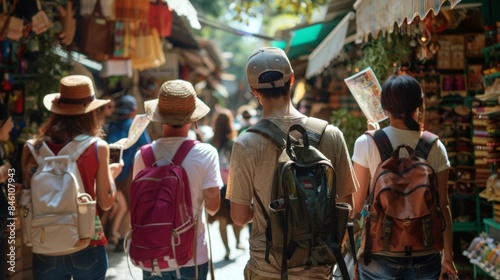 A group of tourists follows a tour guide through the lively street market backs facing the camera. They hold maps and cameras . .