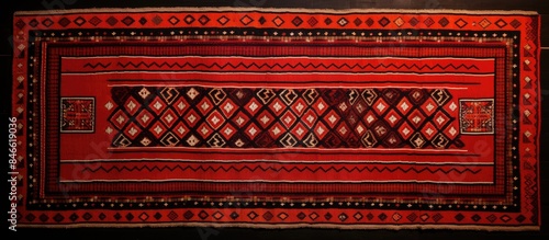 Vintage Arabian Sadu rug with traditional motifs and red colors, perfect for a classic aesthetic with copy space image.