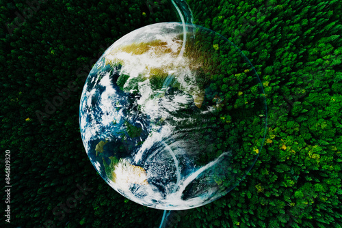 Save the planet. Aerial view of coniferous forest and planet Earth, double exposure