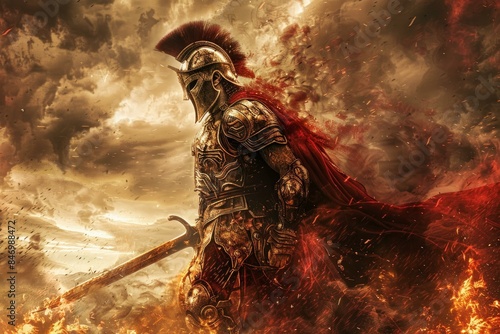 A digital painting of an imposing spartan warrior in full armor amidst a fiery battlefield