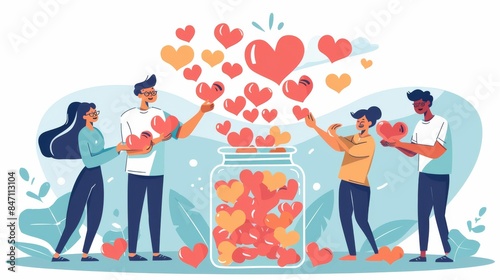 Tiny Volunteers collect hearts in a jar, symbolizing charity, donations, and a generous social community. Share your love, hope, and support with others. Vector illustration.
