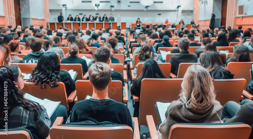 University lecture hall filled to capacity, with rows of students diligently taking notes, the professor at the front delivering a captivating lecture, and the glow of digital screens illuminating