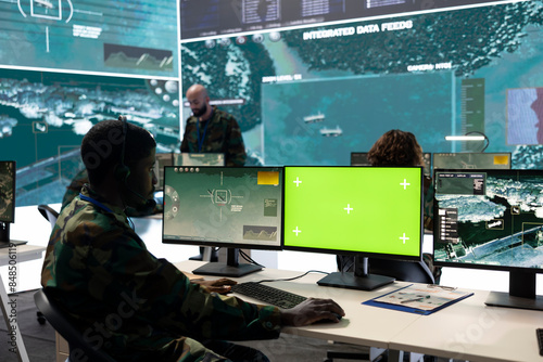 Army personnel monitors isolated green screen and surveillance footage, gathering important battlefield information. Trooper examines CCTV reconnaissance imagery to support soldiers.