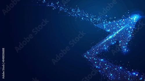 Blue background, blue arrow shape with geometric elements and light points