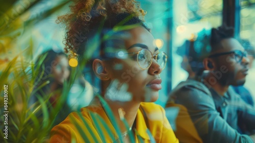 A group of focused entrepreneurs brainstorming in a modern office