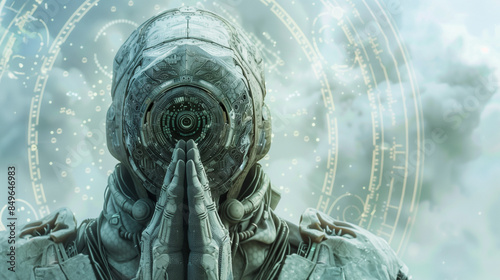 humanoid cyborg robot with artificial intelligence praying with hands in prayer position predicting the future. Wallpaper for a new religions and beliefs with a faceless futuristic oracle
