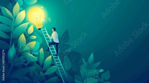 Creativity idea, solution or persuade success, climb up career ladder or business growth, improvement progress, personal development concept, businessman climb up ladder to reach lightbulb grow plant.