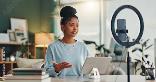 Woman, influencer and home with smartphone for social media or online vlog and live streaming. Female person, content creator and podcast as university student for educational talk and motivation