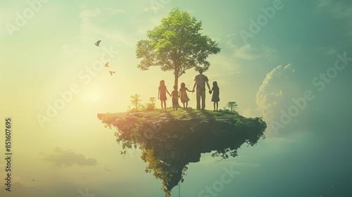 A family reuniting on a floating island, top view, symbolizing an impossible gathering, digital tone, Analogous Color Scheme