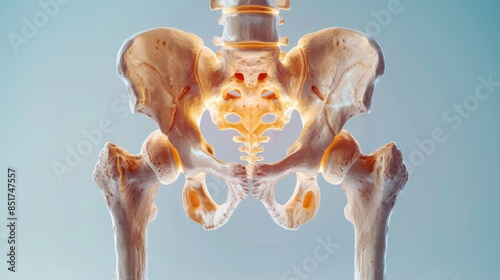 Close-up of a human pelvis and hip bones, isolated on a blue background.