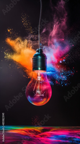 Light bulb with vibrant color powder explosion, concept for creativity and innovation