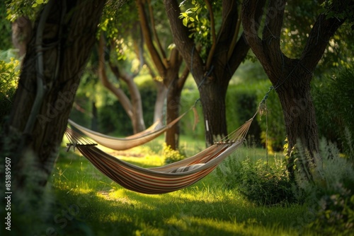 A hammock hanging between two trees in a peaceful forest setting