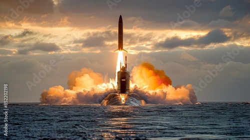 A ballistic missile launches from a submerged submarine, leaving a trail of smoke and fire against a fiery sunset sky