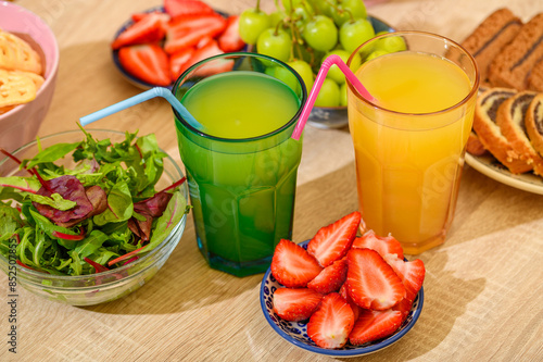 Kolorowe koktajle owocowe, sałatka i świeże owoce leżą na stole