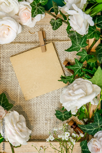 Kartka papieru w ramce - miejsce na tekst, otoczone kwiatami róż i bluszczu.