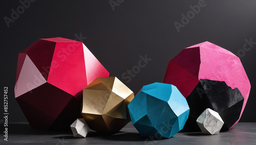 Papier-m�ch� geometric sculptures against a backdrop of crushed velvet, combining the whimsicality of papier-m�ch� with the luxurious texture of crushed velvet, Generative AI