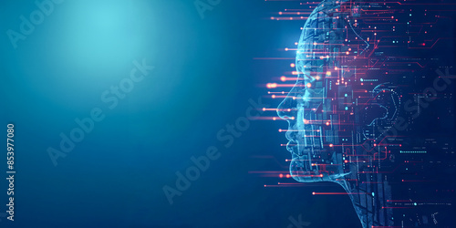Perfil abstracto de una cabeza humana hecha de una placa de circuito digital, código binario y elementos de flujo de datos sobre un fondo azul para una ilustración vectorial del concepto