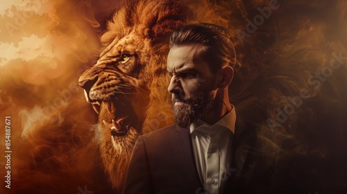 Side portrait of a businessman with ferocious roaring lion in backdrop