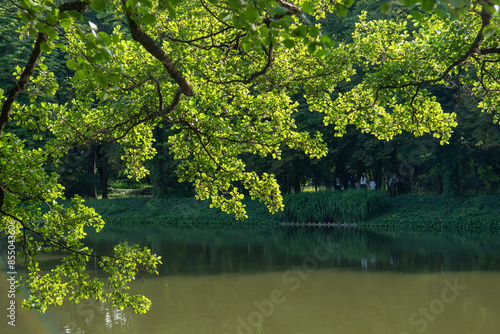 Stary dąb, drzewo, nad jeziorem, Warszawa, Łazienki Królewskie