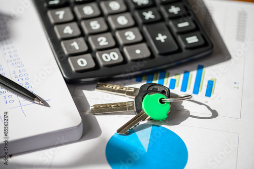 Klucze do mieszkania leżą obok kalkulatora i wykresów, obliczać zdolność kredytową