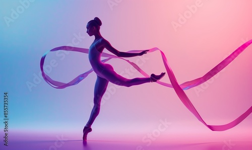 beautiful gymnast in motion with ribbon on gradient background, showing full body