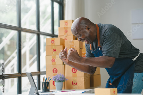 Cheerful man celebrating success in small business with stacked boxes and laptop at home office. Startup concept.