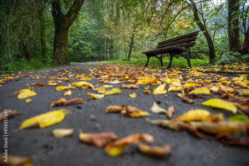 opadłe jesienne liście na alejce w parku z ławką w parku