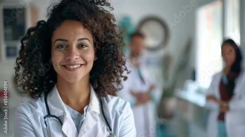Confident biracial female doctor smiling, with blurred mixed race colleagues in background, evoking teamwork, professionalism, inclusivity in medical field.