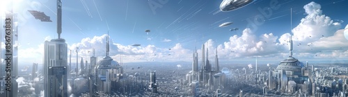 3D scene of a futuristic cityscape with skyscrapers, towers, tall buildings, and flying vehicles. A panoramic view of a megapolis town with the sky as its background.