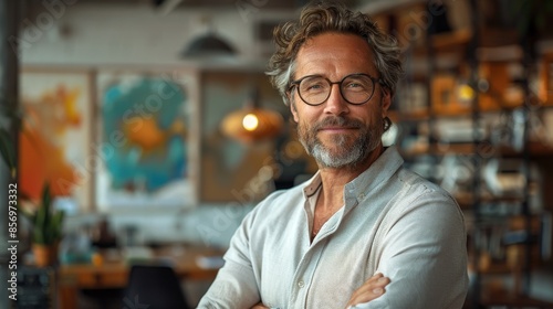 The man, wearing glasses and a light-colored shirt, stands confidently with his arms crossed in a vibrant, creative workspace, suggesting artistic talent and vision.