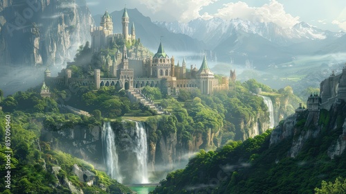 A fantasy kingdom with towering castles and lush greenery, illustration background