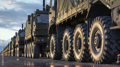 A close-up of heavy-duty truck tires in a row on a wet road, highlighted by dawn light, conveying strength, industrial, and rugged atmosphere.