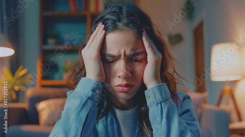A young woman in a casual home setting looks distressed and frustrated, holding her head with both hands, exemplifying stress and worry.