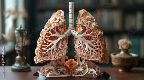 An intricately designed paper craft model of the human respiratory system, featuring lungs, trachea, and diaphragm with precision, ideal for educational purposes and medical illustrations.