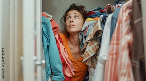 Overwhelmed Woman Tossing Clothes into Disorganized Bedroom Closet