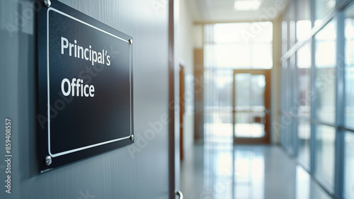 Principal's office door sign in modern school hallway with large windows allowing natural light to flood in. Professional atmosphere with clean and organized space